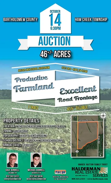 Legal Description: 46.45 acres, more or less, described as Ag Tract 2 - Kathryn Hatton Estate Agricultural subdivision (R/195B); situated in S17, T10N, R7E, Haw Creek Twp, Bartholomew County, State of Indiana.