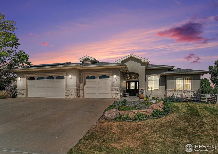 This custom built ranch home is nestled on a peaceful cul-de-sac in the highly sought after Fossil Ridge community of Windsor! This home offers the perfect blend of comfort and sophistication. Featuring 2 primary bedrooms and 2 additional spacious bedrooms! The primary main floor remodeled bath features a large walk-in shower designed for ultimate relaxation. The primary basement bath is a large 5 piece bath with jetted tub. This inviting open floor plan has beautiful plantation shutters and ample storage throughout! There is potential for multigenerational living or hosting guests in style with the fully finished walkout basement including custom built-ins adding expansive living space to this already impressive home. Pre-wired and set up to easily install an elevator making this property adaptable for the future. The spacious 3 car garage includes epoxy floors and ceiling mounted storage racks. Solar system installed and fully owned will transfer to new owners! Enjoy the private backyard deck with retractable awning, hot tub and sunken patio! Situated near Highland Meadows golf course and the exciting new entertainment district coming to Greeley that will feature a stadium venue, shopping, restaurants, and a water park with easy access to the I25 corridor and NO METRO tax