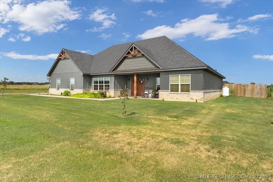 A brilliant balance of classic rustic farmhouse elements with sleek and simple twist of modern living. This home is a wonderful place to start a new chapter. Welcome guests from the impressive covered porch and relax into your leisurely evenings in the shade of the covered porch. The open family, dining and kitchen spaces shine with natural light from the walls of windows. A center island creates a natural gathering place for family breakfasts while allowing an expansive view from the elegant kitchen at the heart of this home. Escape to the effortless luxury of the Owner's Retreat, complete with a large walk-in closet and a serene en suite bathroom. Also featured, a walk-in laundry room with built-in cabinets, sink, and space for a full-sized washer and dryer. Split bedroom with 2 bedrooms and well appointed guest bath. Nice backyard with a covered patio perfect for outdoor living & entertaining. 20X30 shop with cement flooring for additional storage and a wood fence surrounding it for maximum privacy.
