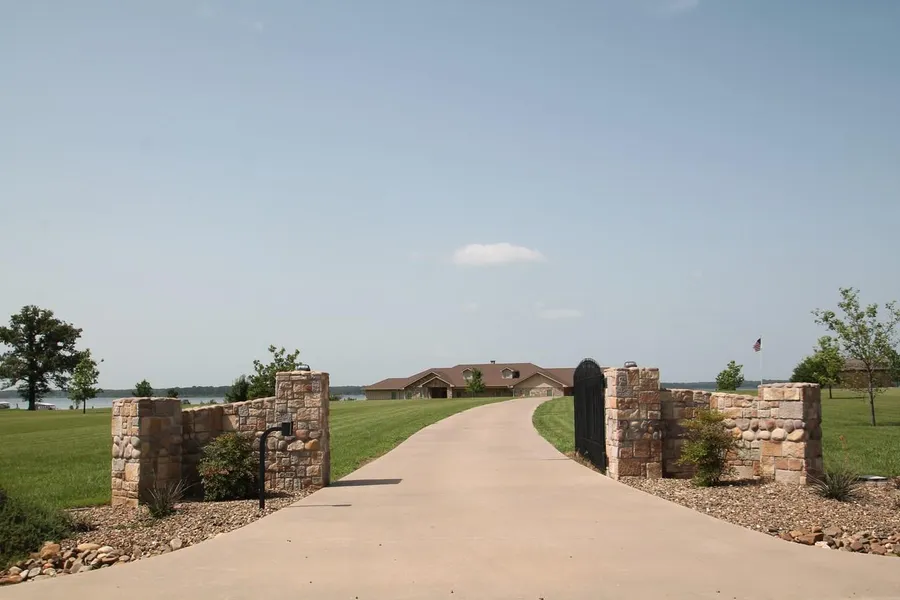 A lake home with an unobstructed, panoramic view of the lake! The home is a long, single level, ranch style home with over 7400 sq ft under roof on more than 8 acres and unrestricted. The master bedroom, the living room, dining room and kitchen, all have great views of Lake Fork. The living room has cathedral ceilings with exposed beams, tract lighting and ceiling fans. It has a massive, stone, 2 way fire place and built in book shelves that will literally hold 100s of books. From the living area you can step out onto a huge, screened in covered patio and take in breath taking sunrises. The dining room is built directly off the kitchen. The kitchen is perfect for entertaining and has a breakfast bar and lots of storage, countertop space and a large island. This kitchen may have one of the largest, walk-in pantries you will ever see. The master bedroom has a massive stone, gas fireplace and sitting area. You can step right out from the master bedroom onto the screened in covered patio. The master bathroom has separate lavatories, large walk-in closets, over sized garden tub, walk-in shower and private water closet. The three guest bedrooms are comfortable in size with ample nice closet space. The mudroom is huge with washer and dryer, sink and tiled. The boat garage and workshop is connected by a breezeway and includes a bathroom. The boat garage is large enough to put a suburban with boat and trailer attached and has heat/air. It has a separate storage room inside the boat storage facility. Here you can drive down to the concrete turn around and then drive right back and park your boat and vehicle all in about 30 seconds. Includes a two slip boathouse with electric lifts, lights and storage closet.