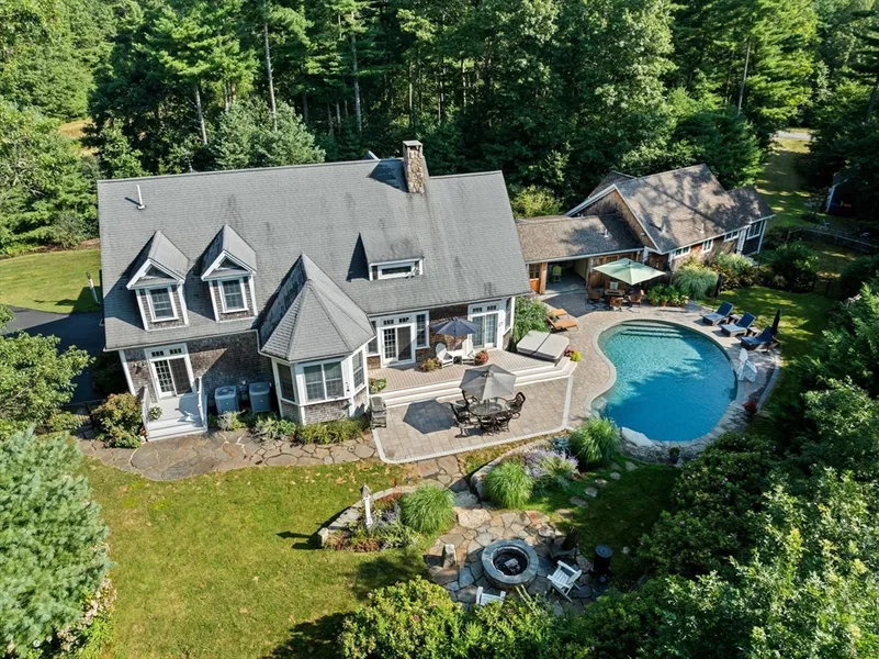 Welcome to Paradise - a true dream home. This custom high quality craftsmanship timeless home was designed by renowned architect Donald Gardiner. This exceptional residence harmonizes rustic charm with modern conveniences. The heart of the home is the stunning custom stone fireplace that soars from floor to ceiling. Gourmet kitchen features hand built cabinets from Maine and Vermont Soapstone countertops, adding an artisanal touch. The great open floor plan seamlessly connects the main living areas, creating a perfect setting for both relaxation and entertaining. The first floor primary bedroom suite serves as a serene retreat with an elegantly appointed bathroom that ensures comfort and tranquility. Step outside to a very private resort like oasis that redefines outdoor living. Beautiful heated salt water gunite pool is surrounded by stone walls, patio space, multi level gardens, and a luxurious hot tub spa. A separate guest cottage offers possibilities & completes this country estate