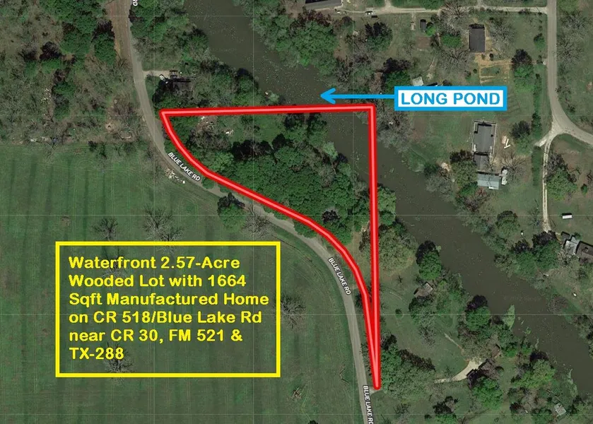 Waterfront 2.57 acres with a 1664 sqft manufactured home with 4 bedrooms & 2 Full bathrooms on CR 518/Blue Lake Rd near CR 30, FM 521 & Hwy 288. Lot features plenty of shade & beautiful views of Long Pond. 400 Ft of Frontage on Long Pond, which is 20 ft deep and 75 ft Wide. Lots of Mature Trees. East of the property is SH 288 5 miles away & downtown Angleton 7 miles away. The location of the lot is 25 miles North of Freeport & 45 miles South of downtown Houston with an easy commute using SH 288. Perfectly priced to build a permanent home or use as a weekend/vacation home to enjoy the tranquility & great fishing.