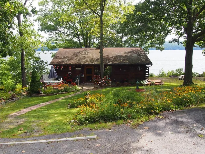 Centrally located between Geneva and Watkins Glen, enjoy Seneca Lake living without the stairs. Drive right under the carport and take a short walk to the front door without a single step. The inviting log cabin with with attractive landscaping sits above the lake taking advantage of the panoramic views. Wether you are inside the house, on the large wrap around deck, or relaxing in the hot tub, the views will not disappoint. Jump in the golf cart or walk the short gravel drive to the beach, dock, and covered boat hoist. Kick back and watch the boats and kayaks go by from large deck built over the water that is shared between lots 2, 3, and 4. There is plenty of parking with the one acre parcel, and lots of storage between an 8x14 shed and second 12x28 shed/workshop with power.