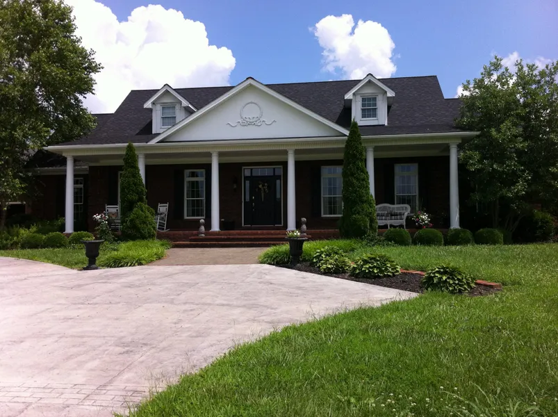 House is a 1 1/2 story, all brick, cape design, with detached 2 Car Garage with extra length for work area. Also features a full length, stamped concrete drive, with an oversized parking area. A Veranda-style Porch, with Southern white columns gives way to all entrances into the home.