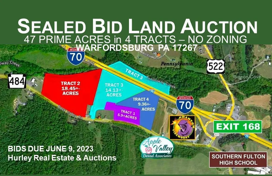 47.84 PRIME ACRES located on Rt 70 at the Warfordsburg PA Interchange EXIT 168, to be offered in 4 tracts and as a whole. The property has over 2000 of frontage on Interstate 70 and approximately 2000FT of frontage on Buck Valley Road. There is no zoning, allowing for unlimited potential for development, including warehouses, retail, industrial, convenience stores, truck stops, fireworks stores, car dealerships, and more. PUBLIC SEWER ACCESS! WELL ONSITE. Easily accessible to I-68/I-70, just minutes from I-81 and Hagerstown Maryland.