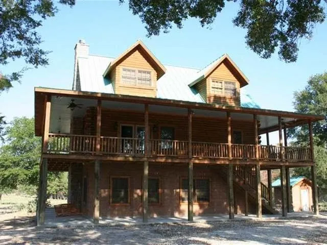 MINI GAME RANCH & RETREAT: Recently completed spectacular tri-level custom Southland Log Home built by Langcamp Custom Homes. Tastefully furnished. 2 large wrap around porches on the 1st & 2nd levels w/ viewing balcony on 3rd. Fantastic solar system designed to make the home one of the finest stand-alone homes should there be a utility outage. 40x60 shop with apartment. Fenced, backs up to 5K acre well managed ranch. 3 ponds. Centrally located between College Station & Huntsville.