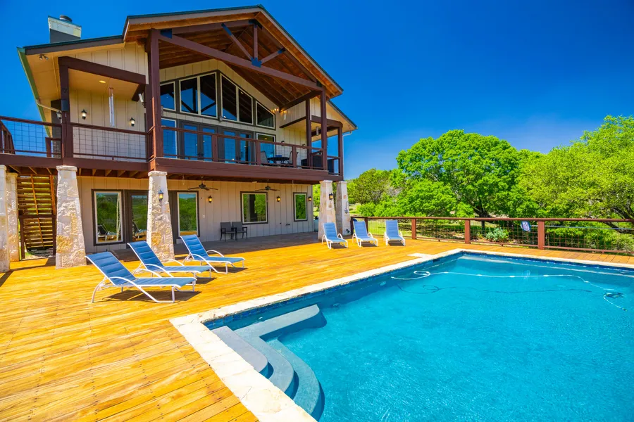 Main Home: The custom 2,106 sqft two-story home consists of one bedroom and one and a half bathrooms. The main home has an open kitchen and living room with incredible views of the Hill Country and overlooks the pool. The second-story deck and large porch around the pool provides a perfect setting for entertaining and observing wildlife.