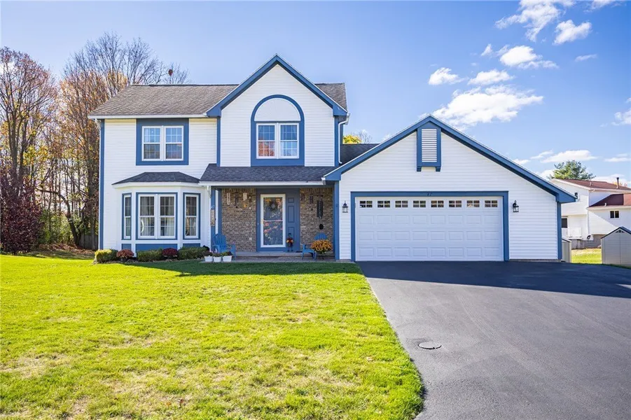 Welcome to this Fabulous 3 Bedroom 2 1/2 Bath Colonial on a beautiful cul-de-sac lot in the town of Chili! This bright and spotless, move-in-ready home has been lovingly maintained and thoughtfully updated throughout the sellers' tenure. The formal dining and living rooms flow nicely to the eat-in kitchen and spacious family room, making this home perfect for those who love to entertain AND enjoy quiet times at home. The kitchen slider opens to the newly updated Composite Deck (2023) which is connected to a 27 foot above-ground pool and overlooks an oversized treed backyard, perfect for summer outside living. The second floor boasts a lovely Primary Suite with a full bathroom and walk-in closet. All three bedrooms upstairs and downstairs family room have new carpeting (2022). The 2 plus car Garage has a built-in storage area. Furry family members? The yard also has professionally installed Invisible Fencing! There are so many upgrades including Quartz Counter Tops; new driveway in 2022; Glass Block Basement Windows; Luxury Vinyl Plank floor in DR and LR 2022; Furnace and Central Air 2021; Water Heater 2020; So many other features: First Floor powder room; laundry hookups in first floor closet in addition to basement laundry; Glass Block basement Windows; Updated Windows throughout; Maintenance Free siding; new appliances and so much more!! Come See!