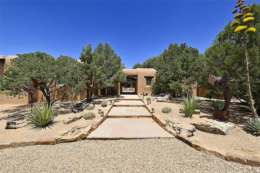 Las Campanas, Estate One, 5-bedroom 5.5 bath Pueblo style home on 2.6+ acres with sweeping panoramas of the Sangre de Cristo and Jemez Mountains. Gracefully landscaped, radiant-heated courtyard connects the main home to the 1,068 sq. ft. guest house and a 419 sq. ft. casita without sacrificing privacy yet creating the ambience of an exclusive estate. There is also an attached studio or flex room with its own entrance and a dedicated cinema room. 2-car heated/cooled garage. Nine Mitsubishi splits and two vented AC/heat rooftop units provide heating and cooling in addition to radiant heat throughout. Vigas and beams, transom windows, 7 fireplaces and flagstone, ceramic, and wood floors. Main house living spaces are open and spacious and emphasize the property's mountain views with gorgeous New Mexico sunrises and sunsets. Chef’s dream kitchen is appointed with new high-end appliances, commercial vent, long center island, an informal dining area, and butler’s area with second dishwasher and washer/dryer. Split bedroom plan with all three bedrooms in the main house offering views of the grounds and mountains. 400+ acre undeveloped area behind the house with hiking trails. Multiple portals provide plentiful space for alfresco dining and entertaining. Green features include solar photovoltaic and tankless hot water. An outstanding property with quick and easy access to 599 (10 min drive to The Market Grocery) and all the cultural, culinary and recreational amenities of Santa Fe.
