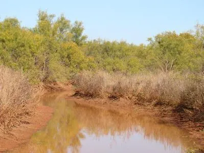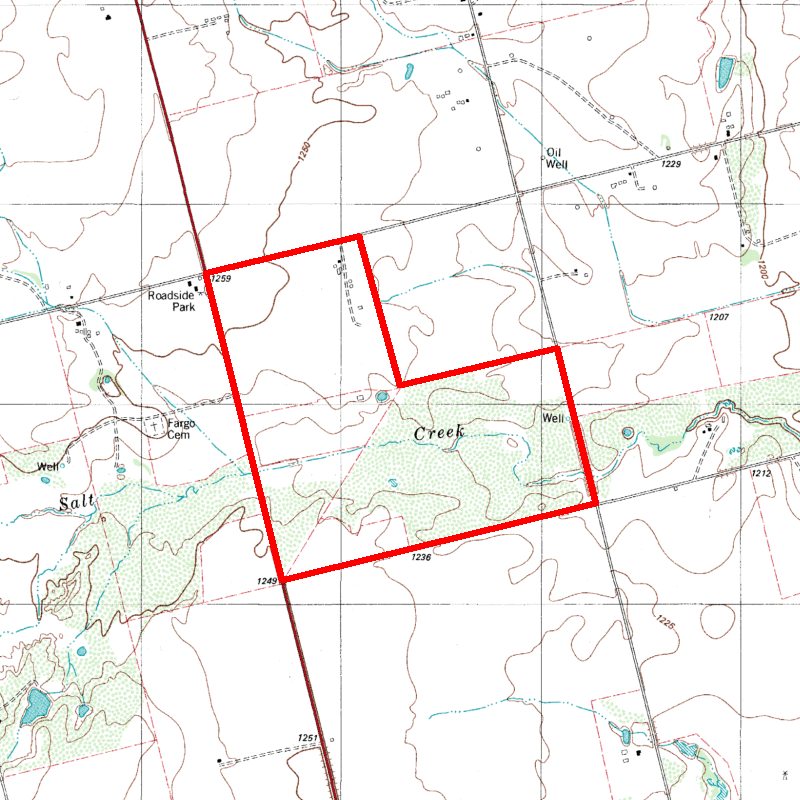 The ranch is mainly flat, with a large draw going through the middle of it. This draw carries the seasonal Salt Creek, which transverses through the property for over one mile. This creek gathers water from an estimated two mile radius around the ranch, and its flow varies from very strong during the rainy season to dry with a few puddles during drought periods. Two large water tanks have been dug off of the creek, which retain water for most of the year due to the large amount of runoff the creek channels. Other nearby streams include Wildcat Creek, which is four miles southwest of the ranch, and the Red River, which is four miles to the east.