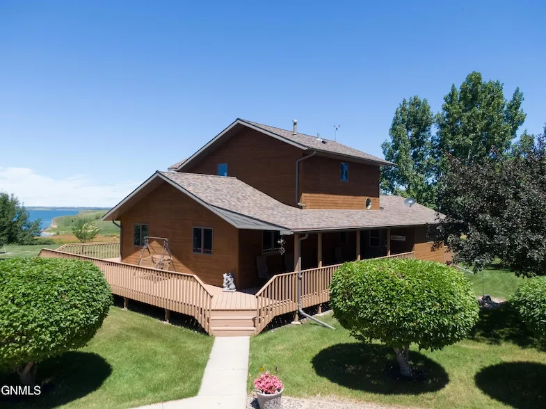 Enjoy breathtaking views of Lake Sakakawea from this custom-built, one-owner home nestled on 1.68 acres with water access. A circle driveway, lined with mature trees, leads you to the welcoming front deck, which wraps around the home to capture stunning western views. Inside, the entryway opens to a spacious kitchen that seamlessly connects to the dining area, a large family room, and a cozy living room with a fireplace. The main level also features two bedrooms, a full bathroom, and a convenient laundry area. Upstairs, take your choice of two stairways leading to the private primary suite, complete with a walk-in closet, en-suite bathroom, and a sunroom offering endless panoramic views of the lake. The unfinished basement provides access to two crawl spaces, perfect for additional storage. Outdoors, the four-stall garage offers ample space for vehicles, boats, and recreational gear, while an attached lawn addition and a charming patio area enhance the property's functionality. The meticulously maintained lawn benefits from a 13-zone underground sprinkler system that draws water from the lake. A short walk down the lake road brings you to the boat landing and a spacious bay, ideal for water activities. Buyer to verify all property details, including Corps of Engineers allowances. Dock excluded.