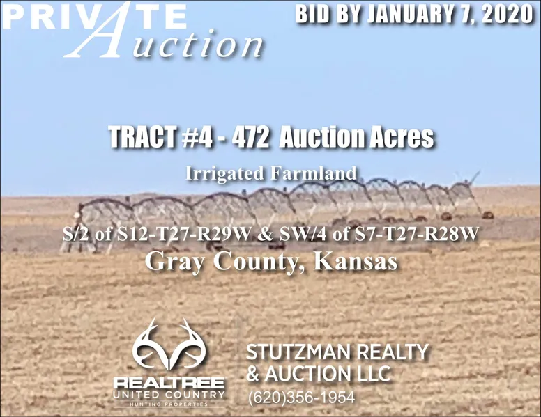 Contact United Country Stutzman Realty & Auction / Realtree Hunting Properties in Ulysses, KS to inquire and bid on this 472+/- acre tract of irrigated farmland with 320+/- acres of non-producing mineral rights.