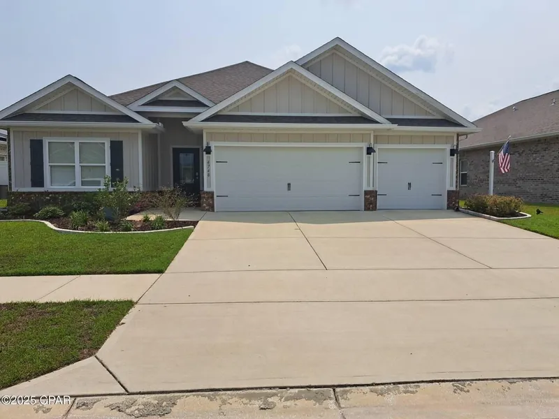 This beautiful Destin floor plan has an assumable 2.5% mortgage for eligible veterans! $10,000 towards Buyer's Closing cost, pre-paids, or Rate Buy Down for any Buyer This spacious home offers plenty of room for everyone, with 4 bedrooms, 3 full baths, and a generous 3 car garage. The open and airy floor plan is perfect for entertaining or enjoying a quiet night at home relaxing. The split bedroom design provides privacy for both the home owner and their guests. The kitchen features an oversized island with cabinets on both sides for ample storage. Granite countertops, stainless steel appliances and a walk in pantry complete this functional kitchen. Primary bath is equipped with granite countertops, shower, and a separate soaking tub. Enjoy unwinding looking out over your waterfront lot and private backyard from the screened lanai. Home was constructed to include smart home technology with monitoring service to control garage doors, front door lock, doorbell, outdoor lighting, and thermostat. Convenient to Tyndall AFB, minutes from North Bay Haven Charter Academy, and a new Publix shopping center is just across the street. The new neighborhood pool and activity field are almost ready for all your summer fun. More photos coming soon!