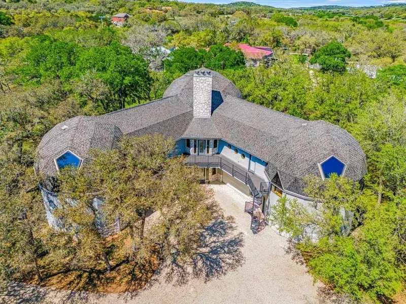 Welcome to this one-of-a-kind, energy-efficient, geodesic custom home. Nestled on 5+ manicured acres in the Texas Hill Country and just 20 min away from the north edge of San Antonio. True detail in design and architecture is shown throughout this neutral element home which has been featured in multiple magazines. With a 20' waterfall at the main entry and stone engraved art, this home offers many exquisite details such as Five full baths * Two 1/2 baths* * 432 sq ft caretaker's studio apartment * 1,148 sq ft of detached, enclosed storage * Custom cabinetry throughout * Large built-in cabinets in primary suite walk-in closets * 3,300 sq ft of 3/4" solid maple & Canadian spruce tongue & groove flooring * Solid maple double helix 6' diameter interior spiral staircase * Four fireplaces * 5 separate AC units; * 15 KW emergency propane generator * Soft-stop 2-person elevator * Metal exterior spiral staircase * Six-yard water spigots throughout the 5+ acres * Chip-sealed asphalt driveway * Wet weather creek along southern boundary * Over 200 mature Oak & Cedar-Elm * 11 bearing fruit trees; apple, pear, peach * 1000 gal buried propane tank. Don't miss the opportunity to view!