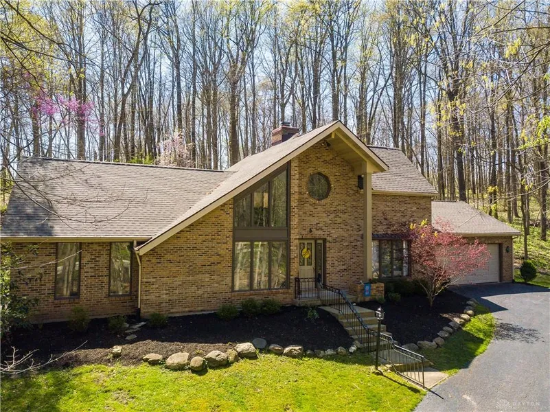 Travel up the winding driveway across the creek to this open concept, modern spacious home! This beautiful brick is situated on just over an acre w/ lovely landscaping and mature trees. The automatic power blinds cover the floor to ceiling windows w/ sights & sounds of nature. The great room is a 29 x 24 light filled space complete w/ hardwood acacia flooring & brick gas fireplace (not warranted). Total of 4 bedrooms, master on main level w/ walk in closet & master bathroom. Laundry is accessible on the main level & kitchen is complete w/ granite countertops an island & newer appliances that stay w/ the house. Updates include new roof and garage door in 2019, new water softener and pressure tank in 2020. Conveniently located just 25 minutes to Wright Pat Air Force Base & only 10 minutes to Springfield! Back on the market due to a failed water sample, owners have recently installed a new UV system and new water sample passed with flying colors!