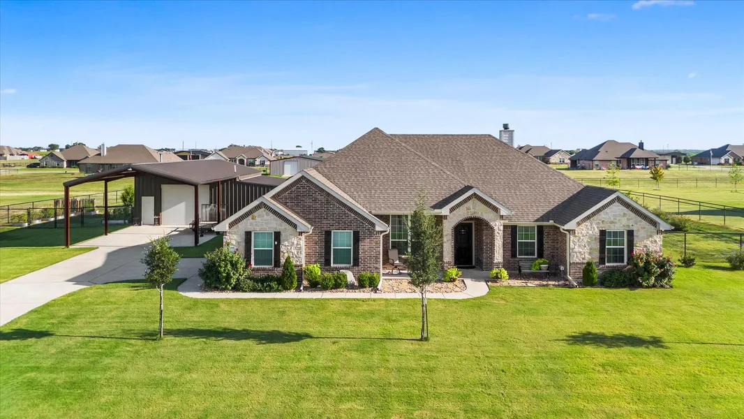 Welcome to your dream home where modern comfort meets country charm on 1 beautifully landscaped acre dotted with gorgeous oak trees.This stunning outdoor paradise offers the perfect blend of elegance and adventure that will make you wonder why you ever lived anywhere else. The outdoor spaces truly set this property apart.Backyard features an above-ground pool cleverly built into the ground.Raised garden beds are already established with their own dedicated entrance ready for your green thumb to flourish.Covered patio overlooks the backyard offering prime views of your personal retreat. Impressive workshop is where functionality meets versatility.This well-appointed space comes fully equipped with a convenient kitchenette for refreshments during project time, a half bath for added convenience, spray foam insulation for year-round comfort and a wood-burning stove to keep things cozy during cooler months.Whether you're tackling DIY projects, pursuing hobbies or need additional workspace this workshop adapts to your needs.An overhang provides covered parking for at least 4 vehicles while an additional covered patio off the workshop creates the perfect spot for morning coffee or evening relaxation. Step inside to discover an open floor plan that flows seamlessly from room to room creating an inviting atmosphere for both daily living and entertaining.The heart of the home features a gorgeous kitchen with pristine white cabinets,a convenient island and a charming farm sink that adds character to your culinary adventures.Living room showcases striking wood accent beams across the ceiling and a cozy wood-burning fireplace. The thoughtful layout maximizes every square foot while maintaining an airy, spacious feel throughout. Parking is never an issue with a two-car garage, long driveway, and additional covered spaces. The property sits in a desirable neighborhood with concrete streets surrounded by well-maintained homes, and best of all, there is no HOA.
