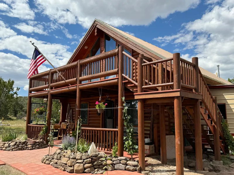 Nestled in mature Pinon and 100 + year old Juniper trees sits this one of a kind Log home. The red cedar logs and interior wood treatments give the feeling of comfort and pride.