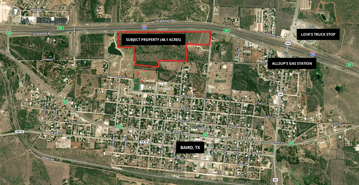 A rare and strategically positioned investment opportunity in the heart of Baird, Texas, located in Callahan County. This tract offers a remarkable combination of visibility, accessibility, and long-term potential—positioning it as one of the most compelling parcels available in the region. The property boasts an impressive 2,878 feet of frontage along Interstate 20 on the north side of Baird, giving it exceptional exposure to constant traffic flow and making it ideal for future commercial, industrial, or mixed-use development. Additionally, it sits less than one mile west of the major intersection of I-20 and US Highway 283, further enhancing connectivity and ease of access for any future user, operator, or developer.