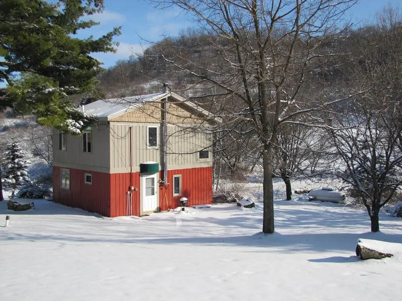 This 48.5 +/- acre parcel offers 37+/- rolling acres of woods with groomed walking trails winding past rock outcroppings to scenic overlooks. 10 +/- acres of tillable ground share the valley with a spring fed stream. The comfy cabin is open concept with the kitchen, living room and dining room sharing the main floor. A barn board stairway leads upstairs to a sitting area and two bedrooms. Outbuildings include a charming granary and a recently updated classic red barn. If you want unique, this could be it.