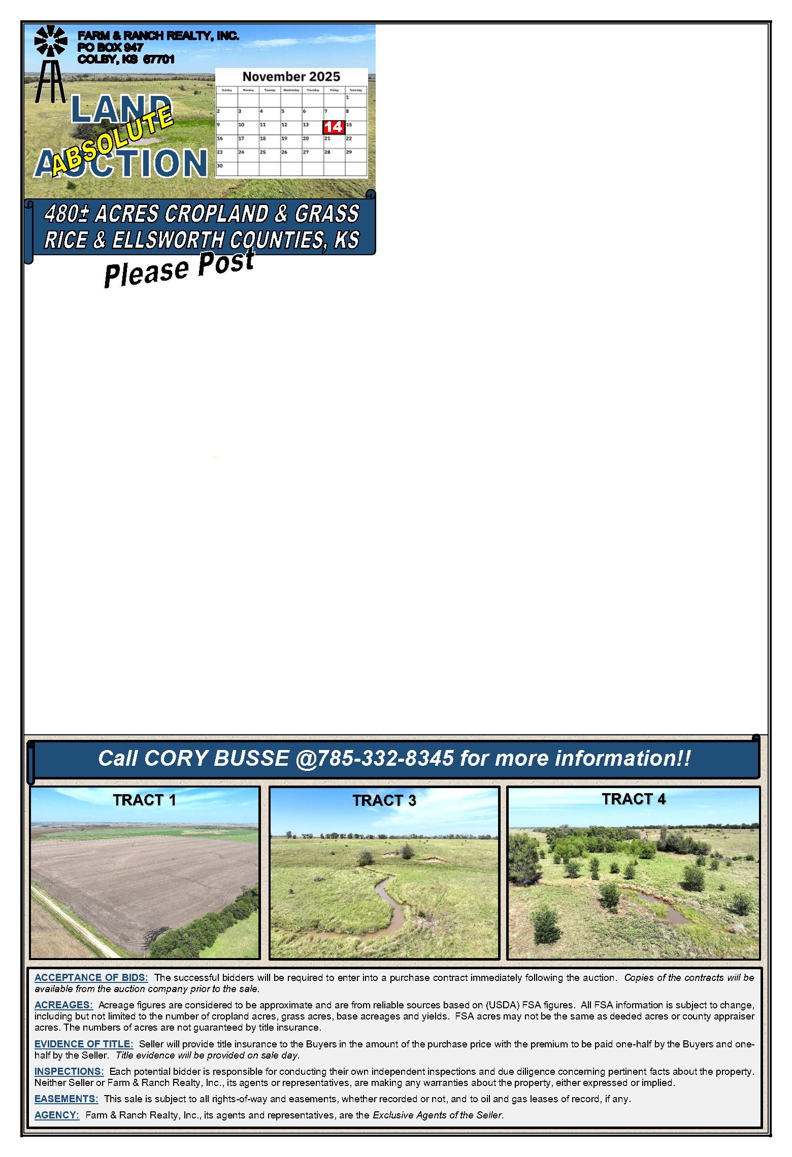 The Dix Family will sell 480+ acres at ABSOLUTE PUBLIC AUCTION, on Fri., November 14, 2025 at the American Legion in Holyrood, Kansas.