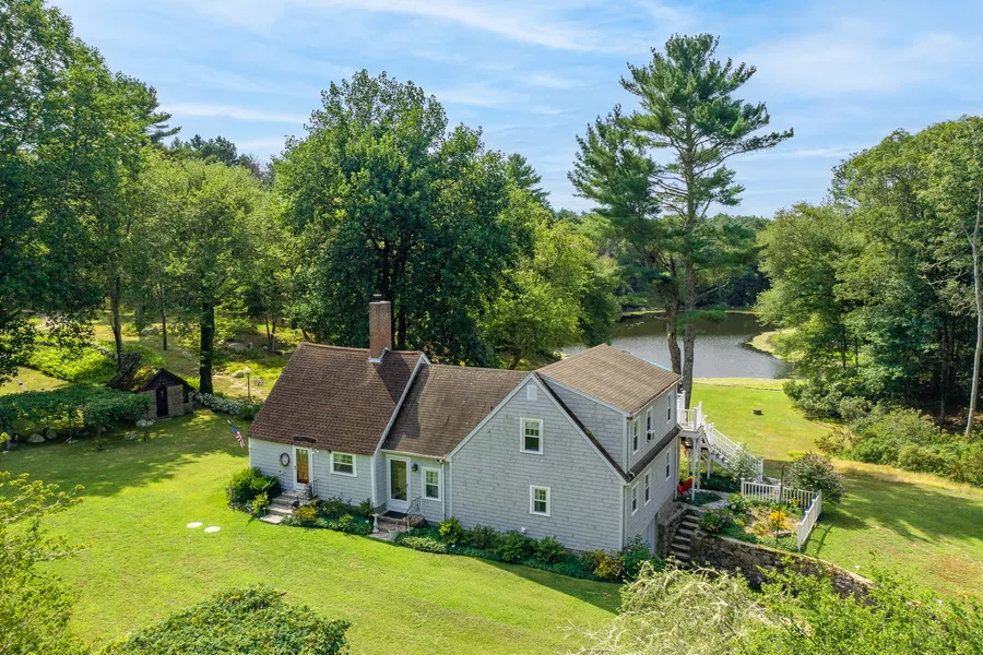 Close to where you want to be yet feels so peacefully far from anywhere at all. This home is surrounded by almost 35 acres of native trees in the middle of the woods, a half mile off the road. With roots in the 1700s, rich in local history, there are many modern touches including a new and modern cooking and dining area. The cooking area features cherry wood countertops, custom made soft close cabinets, integrated top line appliances and a breakfast bar. The living room has a wood stove insert in the stone fireplace. Enjoy a daily visit from the blue heron from the 450 square foot master bedroom with an upper-level walkout deck to view the 2 acre spring fed swimming pond. This 4 bedroom, 3 bath home has new windows, recent roof update, new cedar shingles, updated plumbing and a backup Generac 22,000 watt generator that runs up to 2 weeks with onsite propane. A true homestead, there are several out-buildings around this beautiful home. A custom-built stone and cedar playhouse, built in 1939, with its own wood fireplace and electricity, is a perfect place for children (or adults) to escape or connect. There is also a large, refinished horse barn/workshop/studio, another large workshop building useful for whatever you imagine, and a covered wood storage out-building.