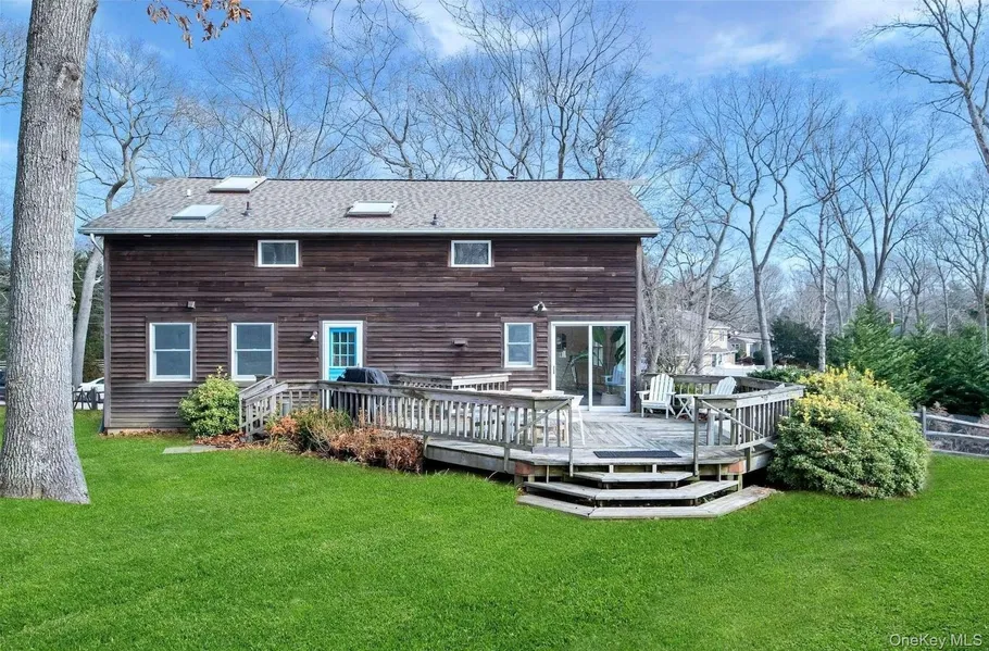 Embrace refined living in this charming residence nestled in the heart of Southold. Enjoy the expansive .75-acre grounds that provide a sanctuary of tranquility. Situated on a meandering hill, this home offers a serene and private retreat. The modern, chic interior is beautifully designed for comfort and style. The welcoming foyer unfolds into a spacious living room, flowing effortlessly into a quaint kitchen that overlooks the backyard and opens to a large deck, inviting you to enjoy al fresco dining. The formal dining area, with separate access to the yard, transforms entertaining into an elegant affair. The main level features a convenient bedroom with easy access to the living spaces and a full bathroom. Ascend to the upper level, where the grand primary en-suite bedroom awaits, complete with a new spa-appointed bathroom, vaulted ceilings, and new wood flooring, flooded with natural light from a wall of windows. Another spacious en-suite bedroom offers a similar allure, with a new bathroom, new wood flooring, and vaulted ceilings. The lower level, equipped with laundry and a cozy recreation space, offers versatility for a gym, lounge, or home office. There’s ample room for a pool to enhance your outdoor leisure. Within a mile lies the highly sought-after Goose Creek Beach, and you’re perfectly positioned to explore the beautiful amenities of the North Fork—vineyards, Southold Town, fine dining, picturesque beaches, and charming local farm stands.