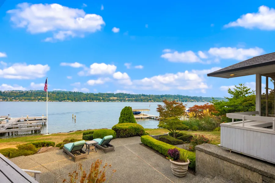 Nestled along coveted East Mercer Way, this east-facing waterfront estate offers more than 100 feet of private shoreline with panoramic views of Lake Washington and Mount Rainier. Designed as a custom home with timeless architectural detail and strong bones, the residence presents a rare opportunity: move in and refresh, embark on a luxury remodel, or explore redevelopment potential.