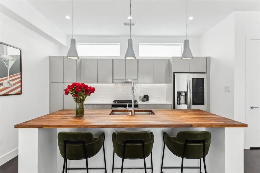 Soaring ceilings and expansive windows fill the home with natural light, enhanced by Hunter Douglas smart shades and a fresh, neutral palette. The chef’s kitchen features a butcher block island, sleek cabinetry, and stainless steel appliances.