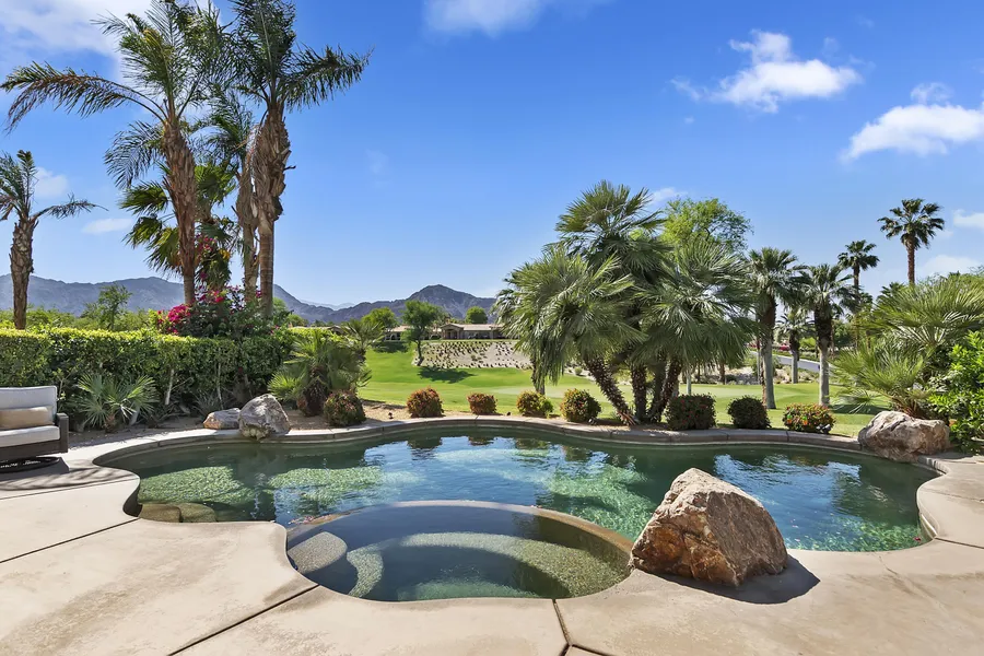 Golfers Retreat! Gorgeous Encanto 2 in Ranch La Quinta CC located on the 1st hole of the Pate course, features a spectacular fairway and mountain view! Come relax in this quality, Turnkey furnished rental! A bistro table at the pool allows you to enjoy the view while sipping your wine! Beautiful custom large pool and spa with fruit trees galore! The quality outdoor living space is beautifully furnished and includes a large Barbecue / Bar area. The front flagstaff courtyard has a dinning table, family style seating with a fire pit. The kitchen boasts a beautiful view, and is truly a chef's delight with all the extras, including a wine & beverage cooler, a gas cooktop and double ovens with a Nespresso coffee maker. The master bdrm is spacious with an adjustable split king size bed, with dual controls and ensuite bath with tub! The second bdrm is equipped with a King size bed and private bath. The detached private casita has 2 bdrm one with a King bed, fridge and a full bath and the other with a Queen. A two-car garage completes with a Tesla charger which with your adapter can be used for other evehicles. The house is stocked with games,puzzles and 2 bicycles! There is an Olympic size pool at the tennis facility at Rancho La Quinta, and access to all of the nine pools, as well as pickle ball courts! Sept, Oct $15000, Nov/Dec/Jan 16000 Feb March $17,000 April $18,000 AVAILALBLE April 2025!!!