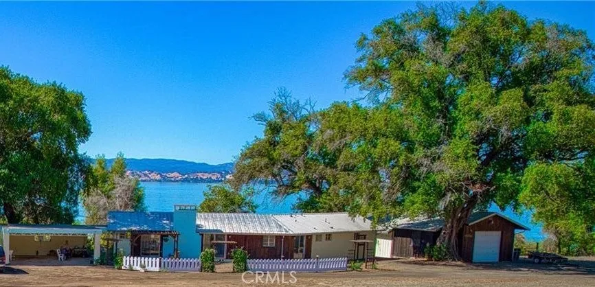 NEW PRICE! LAKEFRONT Estate for sale with Lake ON ONE SIDE and MOUNTAINS ON THE OTHER! Surrounded by unlimited natural beauty, an enviable ranch-style property can be yours on the north bank of California's oldest natural lake just a parcel east of the premium wine grape-growing Ceago Vinegarden resort destination and across Highway 20 from the Shannon Winery! Zoned commercial resort, this flat, 3.6-acre parcel is ideal for multi-use such as a hotel/motel, RV resort, restaurants, campgrounds, timeshare condominiums, etc. It has 154 feet of Clear Lake frontage lined with oak trees on one side and mountains on the other. It's the setting of a remodeled 2-bedroom, 2-bath home that creatively combines concrete blocks and redwood planks on the outside and hardwood planks and tile on the inside. A two-car carport is attached to the house and a detached single-car garage is located on the right side of the home. The front door opens to a mudroom with convenient cabinets and shelving and leads to a spacious kitchen with three lake-facing windows, built-in oven range and dishwasher, wood countertops, lots of cabinetry and a breakfast bar. An adjoining dining area has a sliding glass door exiting to the front yard. Linoleum covers the mudroom, kitchen and dining floor, and hardwood flooring extends from the living room through the hallway and to the two primary bedroom suites. The living room has a sliding glass door that also leads to the front yard and has concrete blocks and bricks that make up the backdrop for the fireplace and built-in firewood storage cabinet. Each bedroom has a bathroom with a shower stall, a lake-facing sliding glass door in one and a mountain-facing sliding glass door in the other as well as spacious, built-in closets with cabinets in one and drawers in the other. One bedroom has a bathroom with tiled floor, wall, and countertop while the other bedroom has a deck and a bathroom with tiled floor. Accessible through the hallway, the laundry room, with hand-laid rock flooring, has two lakeview bay windows and built-in shelving for knick-knacks. Out in the back yard is a vegetable garden and on the beach is a patio for picnicking and relaxation. Want more? Buy the land for sale next door, each up for sale separately, but can be sold jointly as a two- parcel package per seller's consideration. Imagine what you can do with lakefront land zoned commercial resort! Don't forget to click on virtual video tour icon.