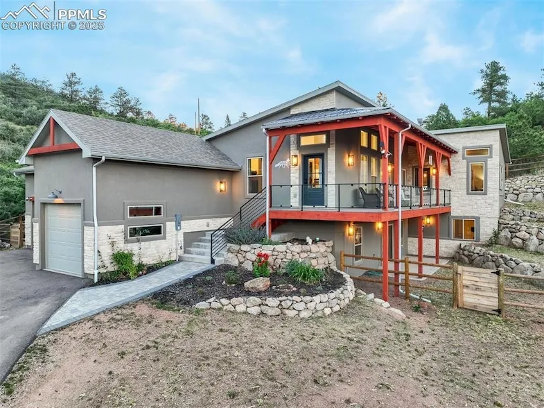 Discover a contemporary masterpiece nestled on 1.73 acres at the base of the mountains, offering panoramic views of the city, stunning rock formations, and the national forest. This exceptional home, crafted with care by a mother-daughter team, has been thoughtfully designed to blend quality, beauty, and functionality seamlessly. Enjoy the natural beauty just steps away, with trails to the national forest only a two-minute walk from your door. Embrace seamless indoor/outdoor living with 45 feet of covered deck featuring glass railings and a private fire pit, an expansive patio accessible from the kitchen, and perfectly positioned windows framing the breathtaking outdoors. No expense was spared in this home, featuring beautiful wide-plank hardwood flooring, designer custom tile work, and hand-picked stone slabs. The open-concept kitchen, living, and dining areas flow onto a large deck with stunning views, creating an ideal space for entertaining. The kitchen boasts a 5-burner induction stove, smart double oven, luxury dishwasher and refrigerator, and a hammered stainless steel farm sink. Retreat to the luxurious master bathroom, complete with a striking black free-standing tub, double vanity, and an indulgent shower. The attached extraordinary closet includes a custom dressing table and shelving. The oversized garage offers 800 square feet with 14-foot ceilings, while the exterior decks and patios provide an additional 600 square feet of living and entertaining space. This wonderful new home is ready to create beautiful memories.