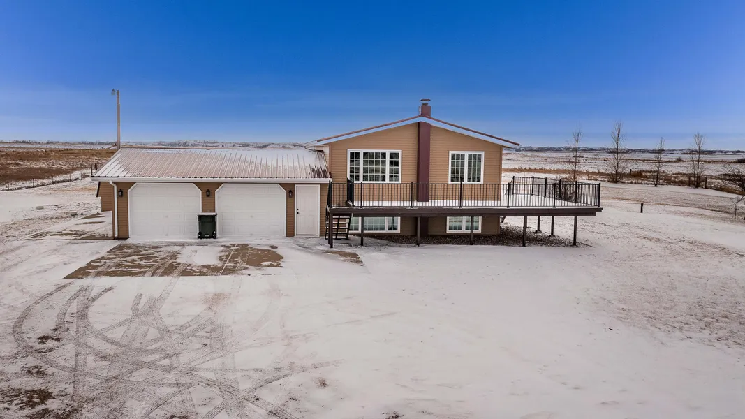 Start the new year out right by making this great country home your very own! 17+acre property offering beautiful views, room to build your dream shop, plus reap the benefits of country life just minutes from town. This 1,824 SqFt home offers NEW steel siding and windows in 2019 (Leingang), new flooring/carpet, newer metal roof, and more. 3 Bedrooms, 2 baths, & spacious living room with an adjoining dining area that walks out to an incredible wrap around deck where you can take in ND's gorgeous sunsets. Daylight basement with large family room complete with wood burning stove, solid oak doors and trim throughout, spacious laundry/exercise room, and plenty of storage. The kitchen is in the midst of renovation - cabinets are included for future homeowner. Attached 2 stall garage is insulated & heated plus finished in steel for durability and easier cleaning. Huge backyard patio that's quiet, private and protected making it the perfect place for grilling or taking in the outdoor beauty. 2 large sheds (storage, tack, chickens, etc.), garden area, and fenced acreage for your livestock or recreational needs. SW Water is connected and membership will transfer. Come see all this wonderful property has to offer!