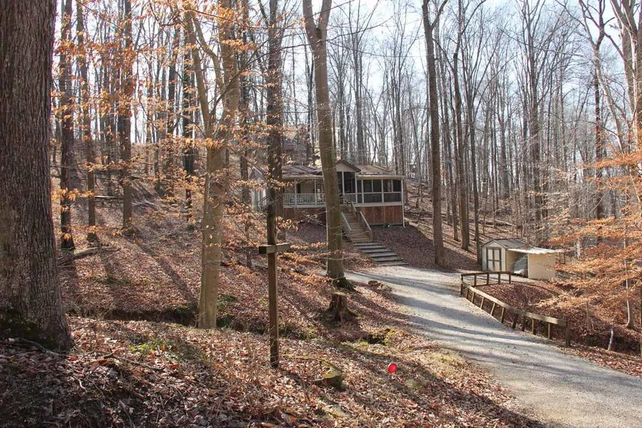 (SOLD - March 2017) Discover inviting design w/timeless appeal, must-have basics plus recent updates! All so near one of the country's top tourist destinations..Hide-A-Way Hills, singular private gated gateway to the famous Hocking Hills since 1961! Start with 2 well-kept lots in a park-like setting w/tall trees,spacious kick-back covered front deck plus screened porch overlooking nature..close to the front security gate,docks, playground, ATV trails, golf. And just a quick walk to fishing lakes! Back deck, newer storage shed w/cartport,updated appliances, fixtures, plumbing. Step in to the greeting/gathering space w/cozy woodstove, and on in to the efficient & inviting great room w/new wood ceiling & bamboo flooring. New wood ceilings, tile, shower, doors, paint, lighting, insulation. Built-ins enhance bath & bedrooms, which both open to major makeover bath. New septic components, recently expanded parking, inviting walkabout space, underside storage, most furnishings included (ask for list of exclusions). Just close & come enjoy!