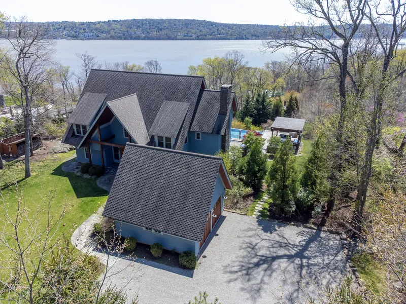 Classic meets modern in this pristine Snedens Landing retreat with Hudson River views from nearly every room. Designed by award-winning architect Dennis Wedlick, whose contemporary houses feature old-fashioned craftsmanship and fine woodwork, including built-in window seats and bookshelves, wide board floors, and hand-built kitchen with top of the line appliances. This special house was expertly renovated by current owners to enhance outdoor living with infinity pool with built-in spa, stone patio, outdoor kitchen, pergola with gas fireplace, and beautifully landscaped hillside path with monumental stone steps. Large American farmhouse style windows showcase panoramic views of the Hudson River, and the house’s public spaces are gracious with a large foyer, sunken living room with fireplace, charming sunroom with wood burning fireplace, well-outfitted mudroom and pantry, and walk out lower level with wet bar (additional 1,800 sf). Spacious ground floor guest suite connects to large family room and can double as first floor primary bedroom suite. The second floor primary suite, designed as a separate wing to maintain privacy, is spacious featuring gorgeous bath with large soaking tub and balcony, walk in closets, office, and loft library. Free-standing two car garage is currently outfitted as cross-fit gym. Located on sleepy, dead-end road near hiking trails in storied Snedens Landing. Peaceful and private and only 12 miles north of Manhattan.