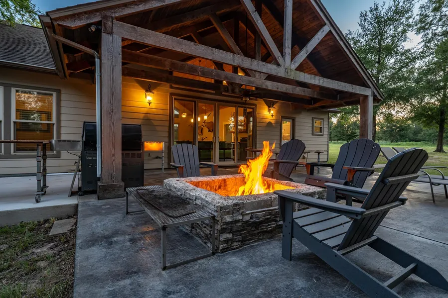 - The spacious back patio features a firepit and outdoor living area, perfect for evening gatherings and entertaining.