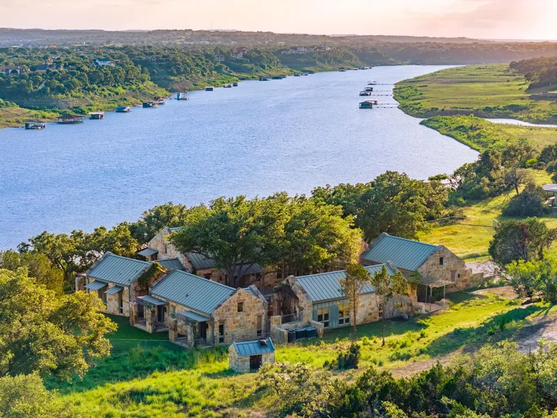 Experience an extraordinary private retreat on 70 pristine acres overlooking Lake Travis, boasting a rare 600 feet of deep-water frontage. This estate offers breathtaking panoramic views of the lake and Texas Hill Country, with thoughtfully designed outdoor spaces that embrace the natural beauty of the landscape. Designed by renowned architect Sinclair Black of Black + Vernooy, this one-story estate seamlessly blends timeless, indigenous materials.
