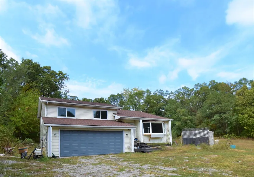 Secluded and spacious tri-level country home with a 2 car attached garage on 3 acres with large yard and red barn! This home has lots of potential for an energetic handyman! The upper floor has a master bedroom with a walk in closet and attached bathroom, two additional good size bedrooms, dining room that opens up to a open deck with a view of the backyard and updated kitchen with appliances The lower level has an additional living room, utility/laundry room, and 4th bedroom or den. New windows have been installed and home has natural gas. Cash or conventional loan only. Home warranty included!
