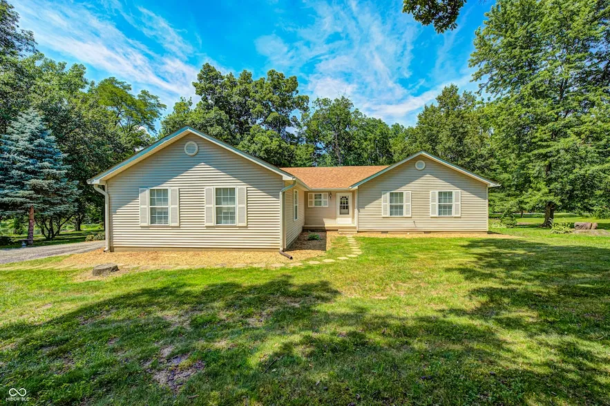 Welcome to your peaceful retreat! Nestled on 2 serene acres, this beautifully maintained 3-bedroom, 2-bath home offers the perfect blend of comfort and nature. Enjoy stunning views of your own fully stocked pond-an angler's dream-set against a backdrop of mature woods and abundant wildlife. Step inside to a spacious open-concept layout featuring tall vaulted ceilings in the living room, creating a bright and airy atmosphere ideal for relaxing or entertaining. The kitchen offers just the right amount of separation while maintaining a seamless flow into the main living space. The primary suite boasts a generous walk-in closet, providing both comfort and convenience. Additional highlights include a large garage with ample storage space and an extra refrigerator, perfect for everyday needs or hosting guests. Located just minutes from I-70, this home delivers the tranquility of country living with easy access to modern amenities and the airport. Don't miss this rare opportunity to own a slice of nature-with room to breathe, space to grow, and views to cherish.