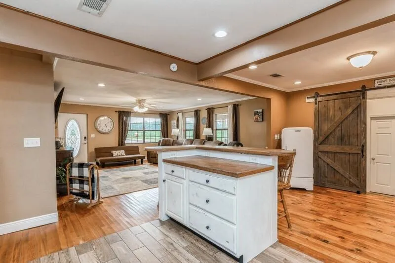 Introducing a captivating countryside retreat! This immaculately renovated farmhouse sits on an expansive 16+/-acre canvas of natural beauty, offering a serene and picturesque living experience. Nestled among mature trees and a sprawling pasture, this property provides ample space for your dreams to flourish.Step inside to discover the charm of rustic elegance seamlessly blended with modern amenities. The heart of the home boasts rustic-style painted cabinets, while the natural wood flooring lends warmth and character. Hand-crafted barn doors exude craftsmanship, adding a touch of nostalgia to the atmosphere. The kitchen is a culinary haven, featuring concrete countertops that beautifully complement the farmhouse aesthetic. An open floor plan enhances the spaciousness, connecting the kitchen with an inviting island and a hop-up bar for casual dining. Stainless steel appliances offer both style and functionality, catering to your every culinary need. Upgraded bathrooms exude sophistication, with updated flooring, fresh paint, and new light fixtures that add a modern touch. Wood countertops, sourced from the property's own trees, embody a true connection to nature. This remarkable property boasts two entrances, providing convenient access. Adding immense value to the package, the 2018 HVAC system and 2015 hot water heater ensure your comfort year-round. Enjoy the best of both worlds with well and city water options, catering to your preferences. The crown jewels of this property are the incredible outbuildings. A brand new 32x36 pole barn with a 15x36 lean-to is a versatile space, offering two enclosed areas (9x13 each) and a 9x32 loft. A 50-amp RV connection and water hookup provide convenience for your travel adventures. The home's electrical system was entirely rewired in 2016, ensuring modern efficiency and safety. A substantial 200-amp power service to the garage, complete with a separate meter, adds convenience and flexibility. An additional 30-foot driveway opens up access to the pasture, enhancing functionality. Original hardwood floors grace most of the home, evoking timeless beauty and connecting the past with the present. A spacious chicken coop within a fenced barnyard area promises a rewarding farming experience. With a brand-new dishwasher in 2023, every detail has been carefully considered for your comfort. This exceptional property is not just a home; it's a lifestyle. Seize the opportunity to own a piece of tranquility and charm, where the fusion of rustic allure and modern amenities creates an enchanting haven. Don't miss out on making this farmhouse dream your reality. Contact us today to schedule your private tour and experience the magic for yourself!