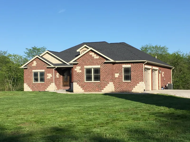 Welcome Home! This beautiful, all brick, custom built, 4 bed, 3 bath home was built in 2017 and is nestled near the back of 19.5 rolling acres of land in Alhambra, Illinois. Everything was thought of during the planning and construction of this house. It features an open floor plan with hardwood flooring throughout most of main level and is built with a focus on the magnificent kitchen that has an extremely large island with sink, dual ovens, custom soft-close cabinetry, quartz countertop, and a large cooktop.