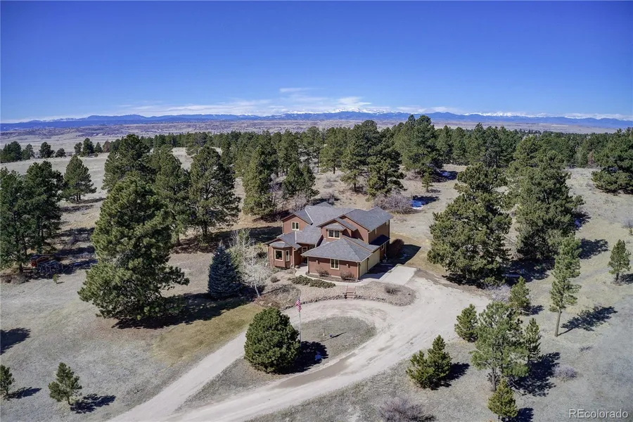 Extremely private lot at end of cul-de-sac and surrounded by majestic Ponderosa Pines! Beautiful home nestled on five acres. This picturesque setting is perfect for outdoor living and entertaining with a wraparound porch and large weatherproof deck, complete with gas fireplace and gas plummed BBQ. Your favorite room will be the living room with it's extended windows, skylights and cozy gas fireplace with nothing but serene trees and wildlife viewed off the back deck. Enjoy the open floor plan, inviting gourmet granite and stainless kitchen with designer tiled backspalash boasting a big peninsula with ample seating! Enjoy movie night in your professionally finished walk-out basement with gas fireplace, game room, open space theater room and wet bar. Large private master suite with recently updated frame-less glass shower, furniture fixture vanity, featuring his and hers walk-in closets. Bedrooms share a jack & jill bathroom and are located opposite of master, both bedrooms with walk-in closets. Over sized 3 car garage, outbuilding, chicken coup and dog run. Included is the theater system. Visit the home yourself to feel the warmth and love within this home! July 2020 hail claim will provide for new roof, exterior paint & skylights!!!