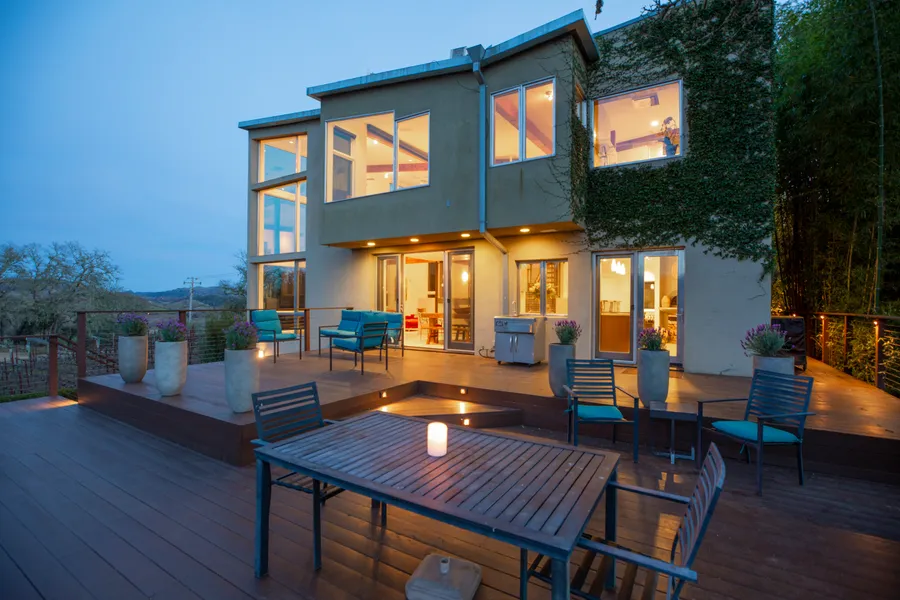 Sited to perfectly drink in the dramatic Alexander Valley panorama, this modernist architectural marvel is set upon 4.5 gentle acres, and is designed to take one's breath away. Dramatic floor to ceiling walls of glass marry with industrial steel and organic woods to create an ideal contemporary aesthetic. On the main living level, open spaces transition logically from living, to dining, to kitchen. An impressive chef's kitchen features stainless steel counters and appliances and an enviable indoor pizza oven. Adjacent to the kitchen there's a sizable view deck for entertaining and al fresco dining. The master suite is arguably this abode's crown jewel, occupying the entire upper level including a sumptuous spa-like bath and massive views of Wine Country. The lower level provides a second bedroom, den, media room, and an easy flow to the hot tub. 2 acres of cult Cabernet complete the picture.