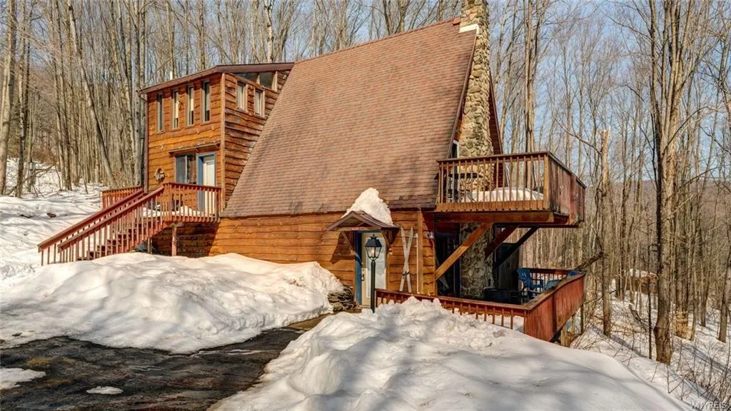 Surrounded by thousands of acres of State Forest and offering good cell service, get the best of both worlds with this timeless chalet. Tucked away in a peaceful wooded setting with incredible hilltop views, this property is close enough to Ellicottville to use as a vacation home, or to use full-time as a permanent residence. Major updates since last sale include a full kitchen remodel with granite countertops, stainless steel appliances, cabinetry, flooring, and stone backsplash; heated ceramic flooring and barn wood beams/walls on first floor, French drain around perimeter, primary driveway blacktopped and resealed; refer to listing attachments for full list of improvements. Sold fully furnished minus a few personal items. The owner will have a new metal roof installed in April or will offer a credit at closing. Showings can begin immediately and offers will be reviewed on a first come, first serve basis. This sale also includes Catt. Co. Tax ID # 61.001-2-12.13.
