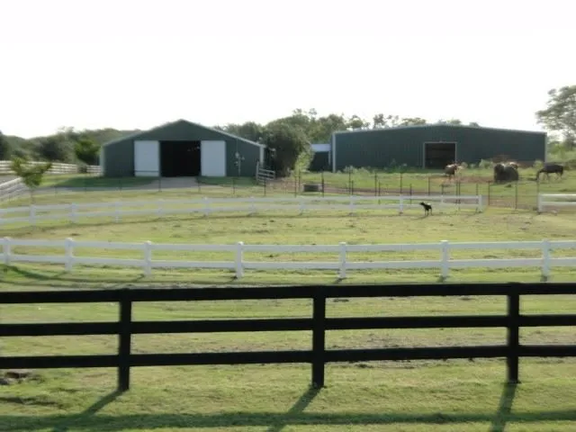 42 stall horse barn with heated and cooled work shop/storage building, office, 8 tie downs, 2 wash bays, and adjoining indoor riding arena.