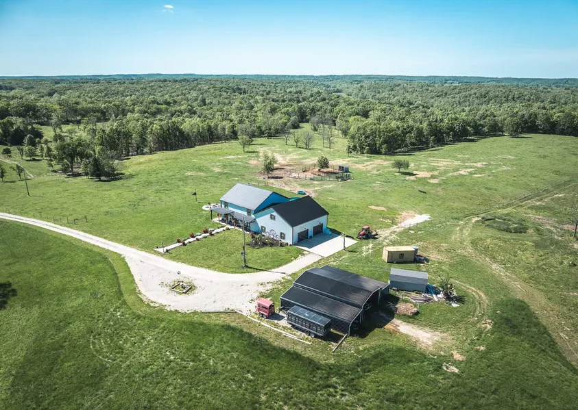 PRICED BELOW APPRAISAL! Exceptional newer modern farmhouse 3-bed 2.5-bath home sitting on 5 acres with NO RESTRICTIONS! 2.5 miles to the Gasconade River access boat input, just minutes from Waynesville, MO, only 19 minutes from Fort Leonard Wood and 36 miles to Lake Ozarks! This property is located inside Swedeborg R-III school district & the specific address uniquely provides options of 3 High School options of Waynesville, Richland, or Crocker. This home offers 2,600 sqft of luxurious up-to-date living with 18' ceilings and 72 windmill fan in the main living area and 9' ceilings in the master. The home features a sleek kitchen with quartz marble countertops, Thermador commercial range/oven, & dishwasher, a commercial glass-front refrigerator, and a custom island light. The master suite offers a skirted cast iron free-standing soaker tub and a zero entry shower with custom shower doors! Standout details include 9’ Andersen double entry doors, 5-panel interior doors, Andersen windows, a built-in fireplace wi the shiplap surround up toward the soaring ceilings and a wraparound porch with recessed lighting, perfect for enjoying the stunning land and picturesque sunsets. An 80x40 structure to store hay, equipment, used as an animal shelter or additional vehicle parking when needed. Other amenities include ADA-compliant 36 main door clearance, Bluetooth speakers in rear pool patio lights, a 30’ above ground pool and a completely finished 1,600 sqft attached heated and insulated garage/shop which features metal walls, perfect for car washing and fits 4 - 5 vehicles and a UTV. This home also features stunning exposed ductwork! The wraparound concrete walkways to the outside lead to a large built-in firepit patio which overlooks the incredible views this one-of-a-kind property offers! This home is packed with stunning modern yet farmhouse finishes! The optional additional acreage provides electric along the fields!