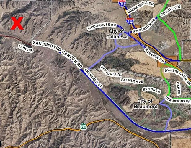 Driving Directions: From I-10 take the Oak Valley Parkway exit. Turn west on Oak Valley Parkway. Oak Valley becomes San Timoteo Canyon Rd. After passing Entranz Blvd, parcel is north of 32300 San Timoteo Canyon Dr. No street access. Take an aerial map and view the approximate location of the parcel from a distance on San Timoteo.