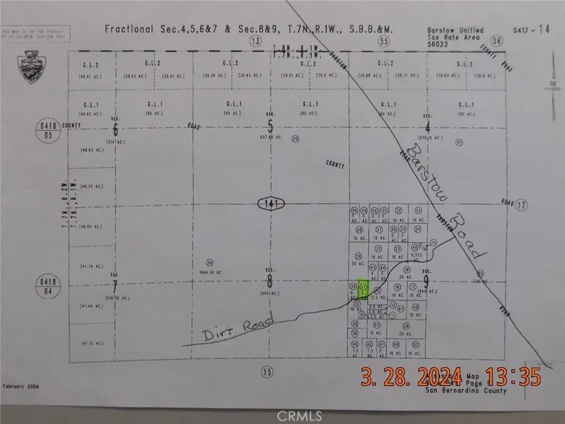 Two parcels, total 10 acres of beautiful desert land on Ranch Road. This road is south of the Slash-X area, west of Barstow Road and north of Brack Road. Together they form a square that is 660' x 660'. The larger of the two parcels, APN 0417-141-46 is 9.37 acres. APN 0417-141-45 is 0.63 acres and is located at the NE corner of the 9.37 acre parcel. Current owner had a well put in years ago and it did produce water. The property was vandalized over the years, including the well. The well has a cement slab, there is also a small cinder block building and another cement slab where perhaps another building used to be. Ranch Road is a dirt road that goes to the property from Barstow Road then jogs around the property. DIRECTIONS: From Barstow Rd at Rimrock Rd.: Go south on Barstow Rd for approx. 11.8 miles to Ranch Rd. Turn right, go approx. 1/4 mile, road will jog to the left for about 400' then turns 90 degrees to the right & continues west to run along the approx. south boundary of Subject property.