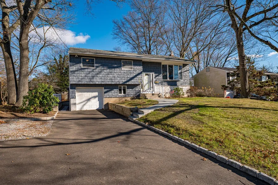 Diamond Four Bedroom Two Bath Hi-Ranch with Oak Floors, Freshly Painted, Andersen Thermopane Windows, Vinyl Siding, Gas Hot Air Heat, Central AC, Oak Cabinets in Kitchen. Fenced Rear Yard, One Car Attached Garage, Cul-De-Sac Location, Belgian Block Lined Blacktop Driveway, 200 AMP Electric. Smithtown Schools, Deck & Shed are a gift. Possible Mother-Daughter with proper permits.