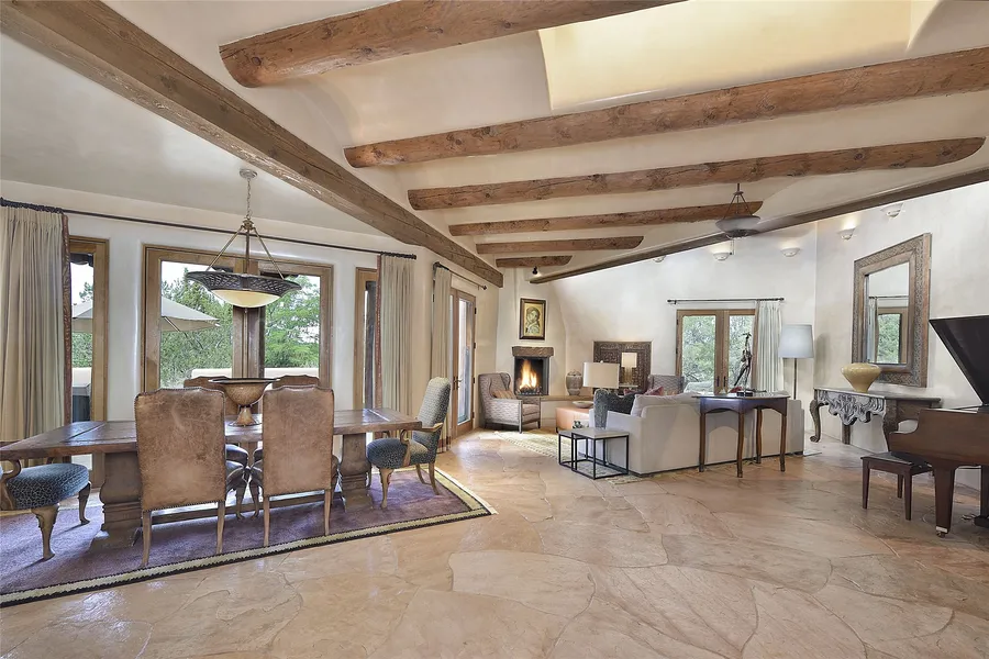 This custom designed four bedroom and five bathroom main house has an abundance of luxury finishes including diamond finish plaster, hand carved corbels, beams, and polished flagstone floors. In addition to the 5,118 square foot main house, there is a 918 square foot one bedroom casita perfect for guests or a long term stay. Many of the unique design elements within this family compound are attributed to Visions Design Group who won a Grand Hacienda design award. The modern layout meets Santa Fe style with an open floor plan offering a seamless flow between the living, dining, kitchen and four outdoor patios. With a private library and custom travertine and Italian tiled bathroom, the master bedroom suite is a remarkable restoring space. The guest wing includes two large bedroom suites filled with light and lovely garden and western views plus a kiva entertainment room. In addition to the three bedrooms, there is a large bedroom/office suite with a galley kitchenette and solarium that is currently used as an exercise studio. This connected suite of rooms offers unlimited potential as an in-law suite or professional office with a dedicated entrance. Entertaining is effortless in the large, fully equipped kitchen with many upscale features including a built-in espresso machine, wine cooler, expansive granite kitchen island and walk-in pantry. Step into the gated front courtyard filled with the soothing sounds of the waterfall koi pond. This impeccably designed property is an exceptional opportunity!
