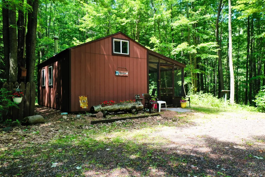 Secluded cozy cabin with +/-5.09 wooded acres located at the end of a dead end road. Kitchen with white ash cabinets and great room with a wood stove and vaulted pine ceilings. One bedroom with a patio door and bathroom with a electric incinerating toilet. Screen porch with views of backyard and fire pit area. Detached garage and wood shed. Electricity and drilled well. The +/-5.09 acres features mature hardwoods, trail systems and habitat for hunting. Located on the atv/utv route.